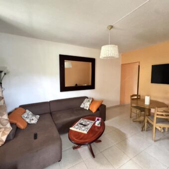 Cet appartement se compose, au rez-de-chaussée, d’une terrasse couverte, d’un séjour/salle à manger avec cuisine ouverte, ainsi que d’une salle de bains avec toilettes. À l’étage, vous trouverez deux chambres climatisées, une salle de bains et des toilettes. L’appartement est disponible jusqu’à fin septembre et bénéficie d’un emplacement idéal.