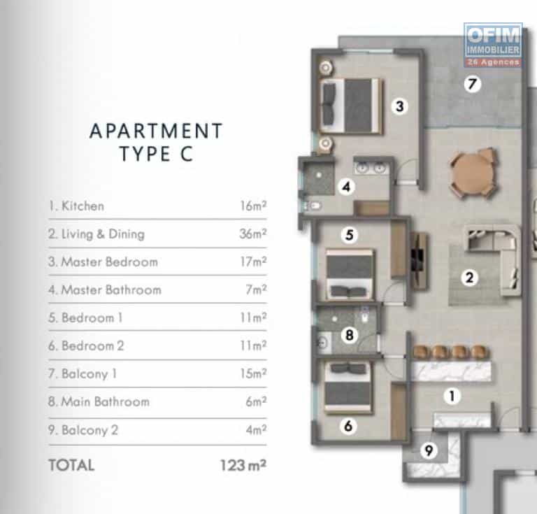 OFIM Immobilier vous propose à la vente un appartement situé au 1er étage à Trou aux Biches, accessible aux étrangers.