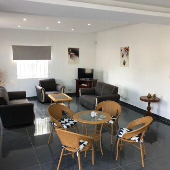 Cette spacieuse demeure se compose d’un spacieux double séjour salle à manger entièrement climatisé, d’une cuisine équipée avec une arrière-cuisine attenante, ainsi que d’une salle de billard pour vos moments de détente. Elle dispose de trois chambres climatisées, deux salles de bain, un toilette invités et un débarras pratique. Pour assurer votre sécurité et votre confort, la maison est équipée de caméras de surveillance, d’un portail électrique et de grilles antivol. Cette villa bénéficie d’une proximité appréciable avec les commerces et les écoles, offrant ainsi une localisation pratique et confortable pour ses résidents.