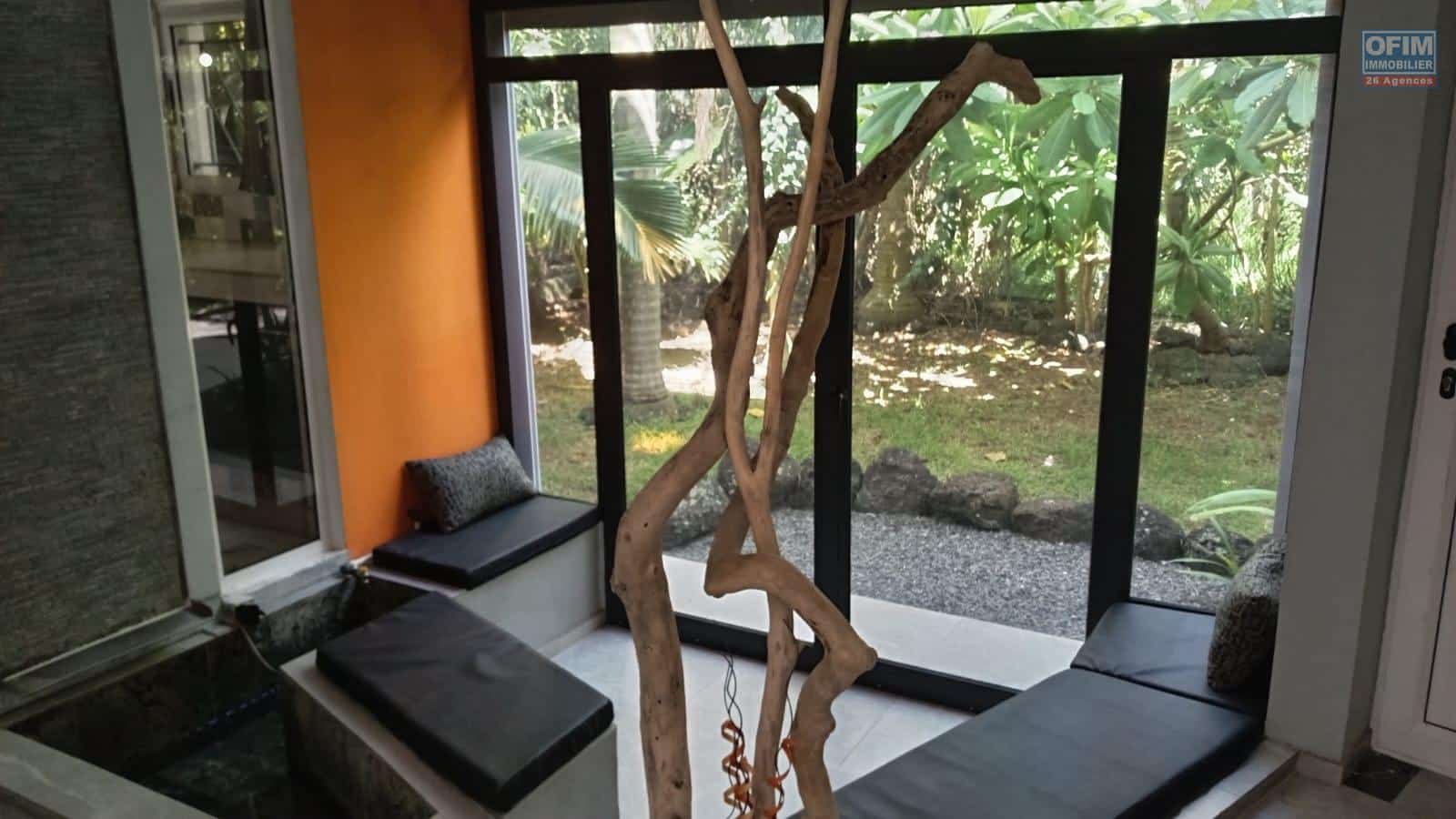 Niché au bout d’une impasse, dans un environnement calme, ce bien bénéficie d’un superbe jardin paysager et arboré de 170 m2. Au rez-de-chaussée, vous découvrirez un salon lumineux, un coin détente sous verrière, une cuisine ouverte entièrement équipée, un espace repas convivial ainsi qu’une salle de bain. Les prestations sont particulièrement soignées avec une fontaine intérieure, un puits de lumière et de nombreuses ouvertures qui apportent une luminosité exceptionnelle.
